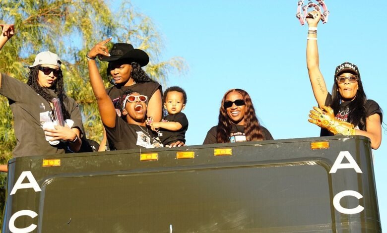 The team rode atop a double-decker bus past thousands of elated fans, many of whom wore bright pink wigs — a tribute to A’ja Wilson, the Aces’ superstar center and 2025 WNBA MVP, who kicked off the season with bubblegum-hued hair.