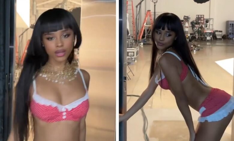 The 23-year-old Grammy winner stunned in a skimpy polka-dot bikini reminiscent of a maid’s outfit, strutting and twisting on a soundstage to her new song, “Chanel.”