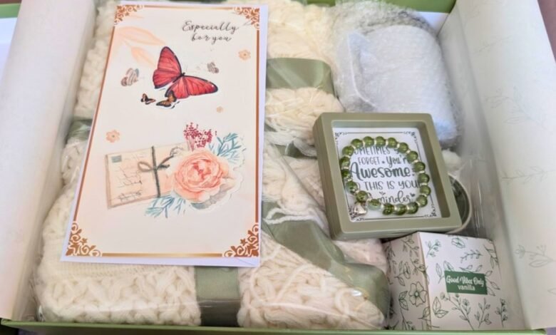 Treat someone special to a little pampering with this self-care gift box. Inside, they’ll find a knitted throw blanket, fuzzy socks, a scented candle, aromatherapy shower steamers, an engraved bracelet, and an insulated mug.
