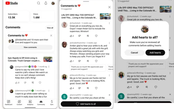 First, YouTube’s new Comments to Heart option will essentially automate engagement, with YouTube creators now able to select an option at the top of their reply stream, allowing them to like comments that YouTube’s system has detected as positive.